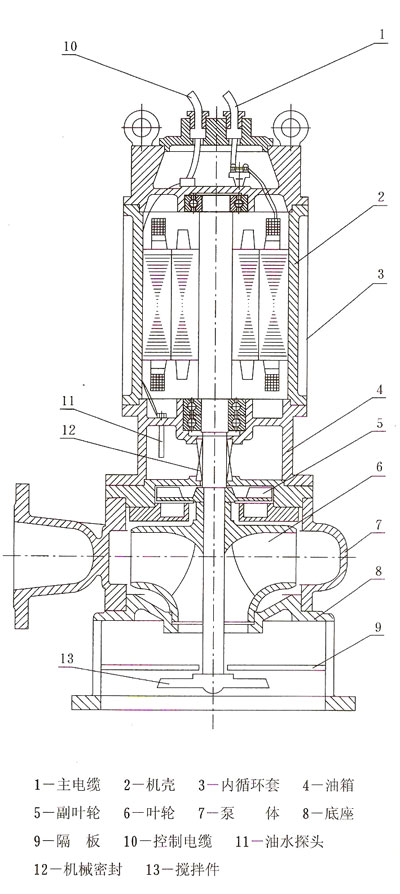 8、油室內(nèi)裝有油水探頭,當(dāng)機械密封損壞后,水進入油室,探頭發(fā)出信號,由控制系統(tǒng)對水泵實施保護。