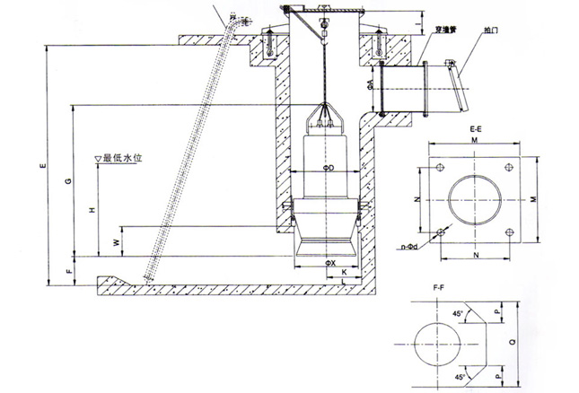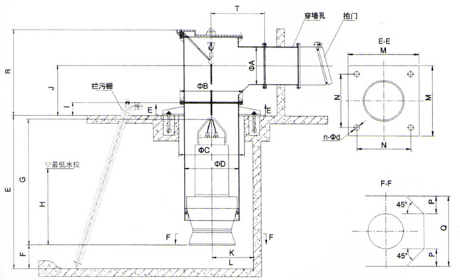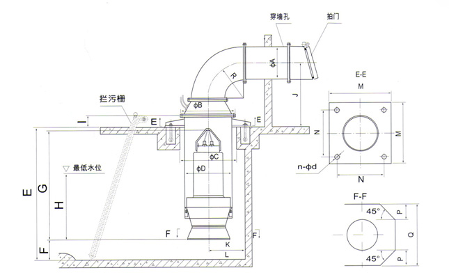(1)、進(jìn)水流道可配肘形、鐘形、簸箕形流道,安裝尺寸表中的流道尺寸為簸箕形流道(僅供參考)。