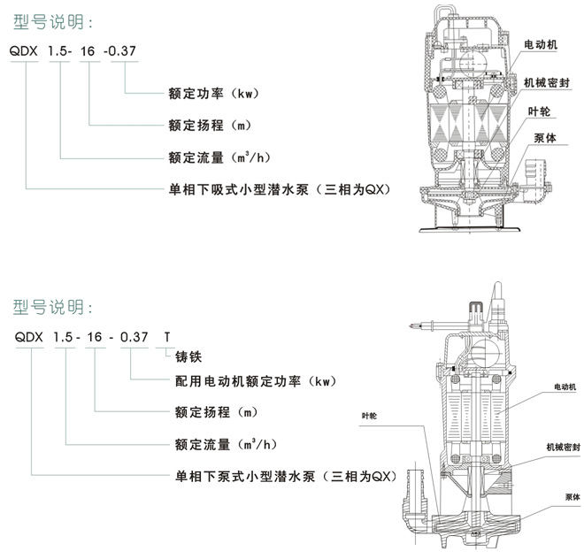 QDX、QX型潛水電泵(以下簡(jiǎn)稱電泵),由水泵、密封、電動(dòng)機(jī)三部分組成。電泵內(nèi)配保護(hù)裝置,電動(dòng)機(jī)位于電泵上部,為單相或三相異步電動(dòng)機(jī),水泵位于電動(dòng)機(jī)下部,為離心式葉輪,蝸殼結(jié)構(gòu),水泵與電動(dòng)機(jī)之間采用雙端面機(jī)械密封,各固定止口密封處采用“O”形耐油橡膠密封圈作靜密封。